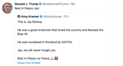 川普轉發了受害者的名字,並寫道:“安息吧,傑!”
