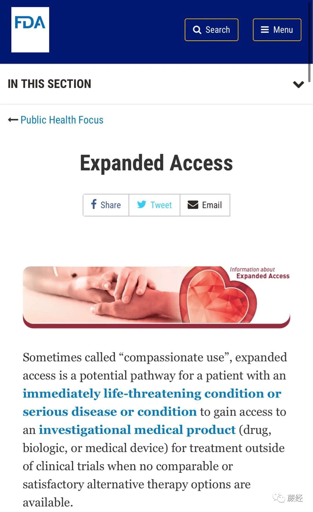 关于同情用药(Compassionate use,又称扩大用药Expanded access或批前用药Pre-approval access),美国FDA原则很明确:对于当下处于危及生命的情况或病情严重的患者,如果无其他有效疗法选择(且患者无法注册参与临床试验),可在不参加临床试验的情况下使用尚未获批上市的在研药物。这个时候接受同情用药的患者必须接受并明确了解这样的事实:使用在研药物可能对治疗有效,也可能导致无法预期的严重副作用甚至生命危险。