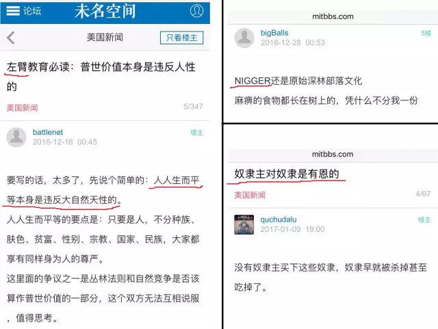 除微信外,川粉在傳統中文論壇上也勢不可擋。老牌中文論壇MITBBS上的“美國新聞”板塊,成了如假包換的極端川粉集散地。這個版面有相當長的議政歷史,其網友多為極右華人,2008年和2012年兩次大選都支持共和黨候選人。此版的特色是隨處可見的種族主義言論和下流淫穢語言,用生殖器詞彙辱罵網友的,崇拜納粹的,鼓吹種族清洗的,宣傳白人至上的,發錶針對黑人,墨西哥人和其他非白人的種族歧視言論的,應有盡有,屢見不鮮。挺川運動當中,此類網友更是異常活躍,對川普的肉麻吹捧隨處可見。現任版主據傳異常自恨,曾經為美國政府誣陷華人科技工作者為“間諜”大肆叫好。大選期間,版主一如既往縱容醜惡言論,對支持川普的網友肆意辱罵他人不聞不問,反而對反對川普的網友不那麼激烈的言論動輒刪帖和封禁。在攻擊和打壓反川網友的同時,挺川網友之間也展開了毫不留情的內部清洗。一個自稱先後給川普捐款兩千多美元的網友,因為瑣事被其他川粉圍攻,被指對川普不忠誠。還有一個活躍多年的老網友,他的兒子患有一種罕見病,多年來受了很多苦,他這次大選也支持川普。但當川普當選以後,他看到川普的所作所為,表示後悔了自己的選擇,因此被其他川粉侮辱謾罵詛咒,甚至他兒子的病情也成了罵人者的素材。對於此類毫無道德底線的言論,版主當然大加縱容。由於版主“治版有方”,該版成了最極端最激進的華人川粉最理想最舒適的網上精神家園。