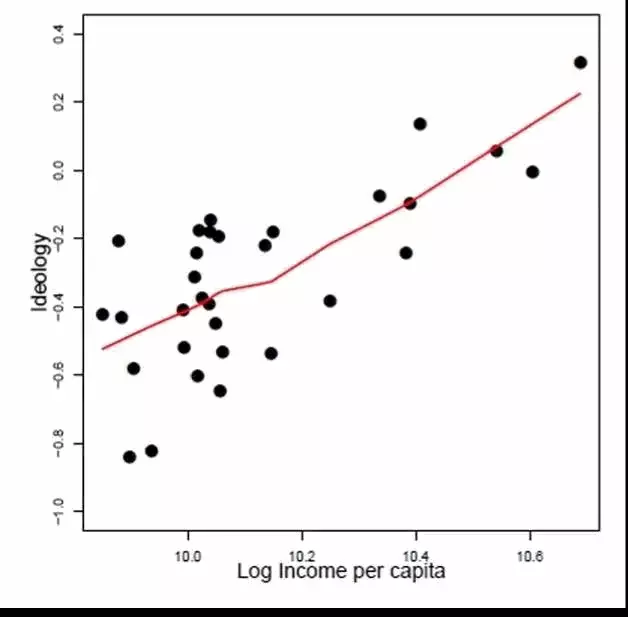 中国意识形态地图 两位作者一共分析了171830个调查样本。样本来源于一套许多人并不陌生的“中国政治坐标系测试”,这套测试从政治、经济和文化三个维度设置了50道选择题(如“西方的多党制不适合中国国情”、“即使有人口压力,国家和社会也无权干涉个人要不要孩子,要几个孩子”),参与者可以选择“强烈反对、反对、强烈同意、同意”。根据结果,判断参与者在意识形态上是偏“左”(保守主义)还是偏“右”(自由主义)。2014年,一共有171830位网民参与了测试,他们的答案以及个人信息便是论文的分析材料。 哈佛和MIT的两位研究人员认为中国社会的意识形态是一元的。所谓的一元指的是政治上左派(中国的左右和西方的左右是相反的)的人更可能强调国家和民族至高无上,更可能经济上保守,支持返回到社会主义和经济的国家控制,文化上也趋向于保守,支持传统的儒家道德观。与之相反的是,政治右派支持宪政民主和个人自由,更可能支持经济自由,支持市场导向的改革,支持现代科学和性自由等价值观。 根据中国特殊的语境,论文作者将“左”(保守主义)定义为对威权体制、国家统一和安全、社会主义经济政策、传统文化价值的偏好和重视;而“右”(“自由主义”)则被定义为对市场化改革、民主自由、现代科技的认同和提倡。 对 171,830名测试者的数据分析发现,哈佛和麻省理工的学生发现,一个地方的现代化水平越高,生活条件越优越,那个地方的人就越认同“自由主义”;反之,现代化水平偏低、人均收入上不去的地区,民众就越表现出对“保守主义”的迷恋。 如图所示,沿海的上海、江苏、浙江、广东以及北京、山西和湖北由自由 主义占主导,而内陆的新疆、内蒙古、湖南和江西则最保守。作者推测,这一结果与政府强调儒家道德观和民族主义不无关系,但需要展开更深入的分析。 那么,中国到底地方偏“左”,哪些省市偏“右”呢? 论文经过测试结果统计,划分出10个最“右”和10个最“左”的地区进行排名,看看你的家乡上榜没有? 被划入“自由主义阵营”的地区中,得分最高的依次是上海、广东、浙江,此外还有北京、江苏、福建、海南、山西、湖北、辽宁。 与此相反的是“深红”的“保守主义地区”,边远的新疆、贵州和广西占据前三甲,宁夏、河南、江西、湖南、安微、内蒙古、河北紧随其后;“不左不右”的地区是天津、重庆、四川、吉林、甘肃、云南、山东、陕西、黑龙江。 这种划分与人们的印象大多相吻合。2013年中,知名自由派学者茅于轼本准备前往湖南长沙演讲,没遭到来自岳阳、株洲、长沙等地“左”派人士的抗议,他们手举毛主席画像,高喊“声讨汉奸茅国贼”,活动无奈被迫取消。 东南沿海地区得改革开放的风气之先,平均生活水平更高,更容易体认和容纳“自由”理念; 论文统计得出的结果是,上海、广东、浙江、北京这些地方的人均受教育程度、平均收入和对外开放水平在国内都属前列,因而这里的居民也更认同“自由主义”。 而在发展程度不够的地区,“左”的色彩相对更浓。 以下是论文观点及图表精选: 收入越高,偏好“自由主义”的人群比例越大 受教育程度越高偏好“自由主义”的人群比例越大