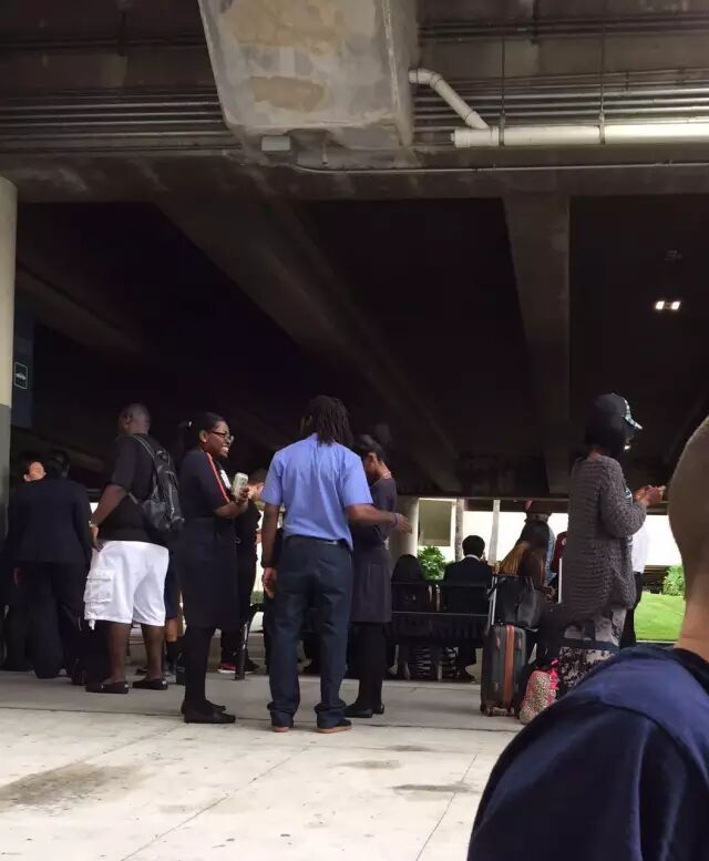 這時可能以為又有人開槍,人們突然扔下手裡的東西,到處亂跑。閨女和幾個隊友還有20來個Jet Blue的工作人員躲進一間屋子裡,他們把行李堆起來堵住門。有的隊員一陣奔跑後,行李手機已經全找不到了,借了別人的手機給家長報平安。看來閨女是個守財奴,她背包拖箱都帶着。女兒怪我說,下次你可不可以不要這麼大張旗鼓地找我啊,我只是在一個沒有手機信號的地方,沒法聯繫。 (女兒發回來的機場內當時的情景) Fort Lauderdale機場暫時關閉了。不少飛機已經落地,但是只能在跑道上等着不讓人進機場。比如教練本來1:25落地的,但現在9點多了還在飛機上,據說他的飛機是跑道上的第十五架,都在等,都沒有讓下飛機。副教練剛生了孩子,說和家人一起躲在機場的一個廁所里。50英里以外的飛機,則都改道去了別的飛機場,隊員們有降落在Fort Myers機場、邁阿密機場、West Palm Beach機場、Tampa機場、以及奧蘭多機場的。