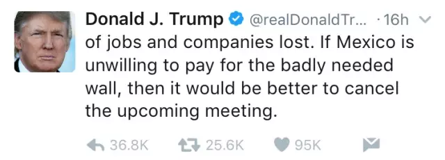 川普今晨發推表示,美國對墨西哥有600億貿易逆差,NAFTA(北美自由貿易協定North American Free Trade Agreement)這個不平等條約讓美國承受巨大的商業和工作機會損失。如果墨西哥拒絕出資修牆,還不如取消下星期的會面。