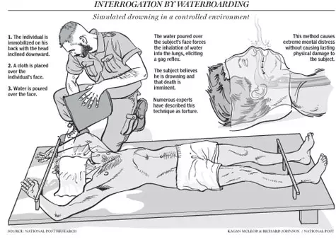 【圖姐科普】下圖是水刑的一種。做法是令嫌犯躺在特製長凳上,腳高頭低,固定四肢。在頭部蓋上布並持續澆水,讓嫌犯產生溺水瀕死感,曾被廣泛用於審訊恐怖襲擊嫌犯。