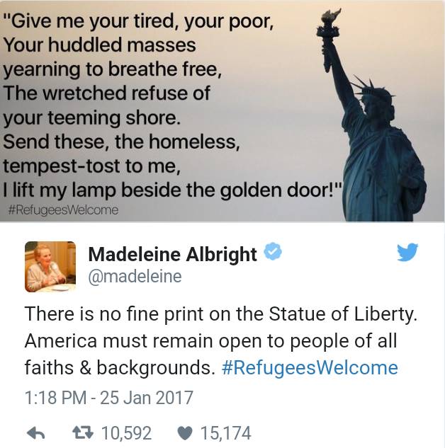 奧爾布賴特說自由女神像上並沒有印任何隱晦的排除條款,美國必須向有各種信仰和背景的人開放。她說她在天主教家庭長大,然後成為聖公會教徒,後來又發現自己是猶太人,現在她已準備好登記為穆斯林以聲援難民。