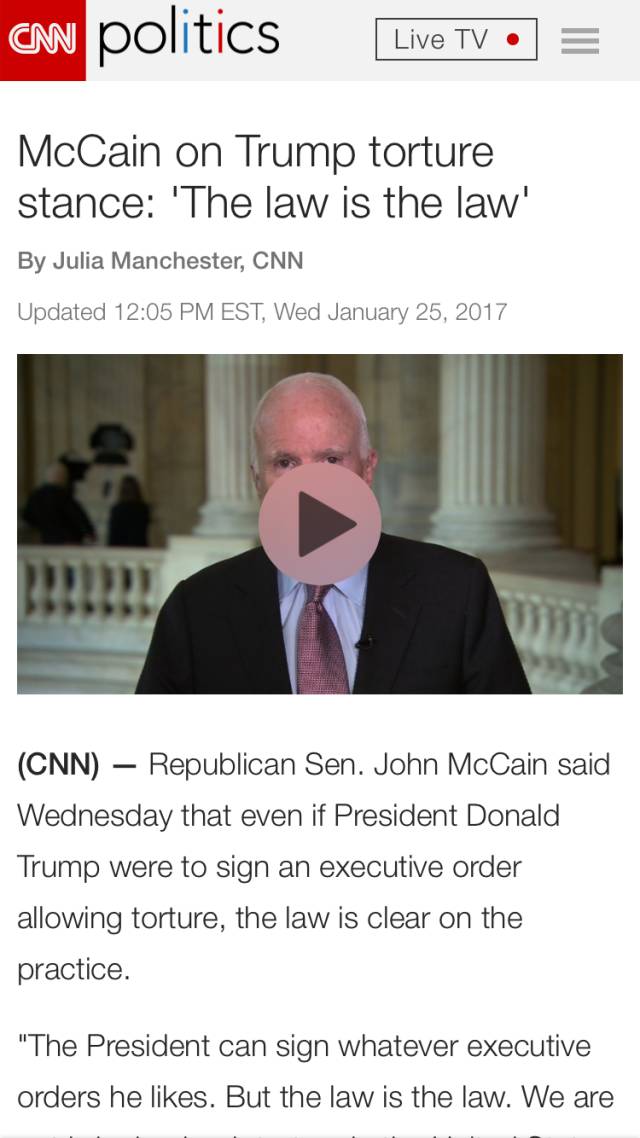 共和黨參議院約翰麥凱恩堅決反對重啟酷刑,並表示就算川普簽署總統令,酷刑依然是違法的。麥凱恩曾在越戰被俘,並遭受酷刑留下終身殘疾,至今手臂不能舉過頭頂。