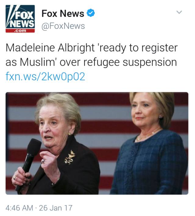 有消息稱, 川普計劃暫停美國難民計劃120天, 美國前國務卿奧爾布賴特1月25日在推特上宣布她已準備好登記成穆斯林以示對難民的聲援。