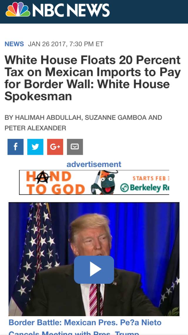 白宮發言人斯派塞在空軍一號上告訴同行記者,川普有意將從墨西哥進口商品的邊境稅提高到20%,用來支付修牆費用。墨西哥是美國全球第三大貿易夥伴,第二大出口國。提高進口關稅無疑將提高進口商品價格,並由美國消費者買單。提高關稅也將重創墨西哥經濟,甚至可能引起社會動盪和難民潮。