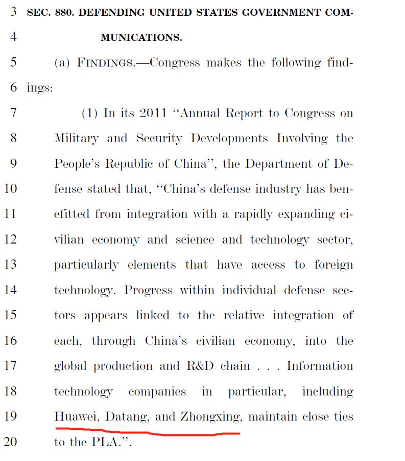 这项措施也将适用于其他几家中国公司,包括海能达(002583)、海康威视(002415)和大华股份(002236)。 IBDATA数据显示,上述三家公司均有大量境外业务,海康威视2017年境外营收高达122.44亿元,占总营收比重为29.22%;海能达2017年国外销售收入达32.29亿元,占总营收比重为60.34%;大华股份2017年境外营收68.07亿元,占总营收比重为36.12%。 中兴通讯成为美中关系的一个关键点,此前美国政府禁止美国供应商为中兴供货,称该公司违反了2017年就伊朗和朝鲜违反制裁协议的条款,然后否认它的违法行为。美国声称,中兴也在向中国军方非法转让美国技术。 该法案表明,国会越来越反对特朗普重新考虑对中兴通讯的处罚,称这是对该国习近平主席的一种支持。据此前估计,中兴通讯或因美国禁令损失至少31亿美元。 特朗普曾表示,他将“设想”对该公司处以修订后的罚款,包括要求该公司任命新的董事会,并支付“巨额罚款”(约合13亿美元)。 星期三,美国国务卿蓬佩奥告诉众议院外交事务委员会,政府将制定一个计划来降低中兴对美国造成的风险。他说:“我们要把这件事办好。” 星期四通过的国防政策法案是H.R.5515。 据一名参议院共和党助手透露,将于周四公布的参议院国防法案草案将包含限制特朗普解除对中兴通讯制裁能力的措辞。该措辞是法案中加入的外国投资条款的一部分,要求特朗普证明解除制裁不会损害国家安全。 以下为部分法案内容: 【2018年5月26日更新:】 海能达、海康威视、和大华等视频监控相关中国企业的禁令是由密苏里州的议员代表Hartzler提出的修正条款里限制的。 对于以上议案,海康威视5月26日声明如下:“关于禁止美国联邦政府向海康威视等中资企业采购视频监控设备的提案是没有事实依据和证据的,提案人的指控带有明显的主观臆测和偏见。海康威视是一家商业公司,恪守商业伦理,严格遵守所有适用的法律法规,开展全球范围的业务经营,致力于为各个国家和地区的安全和发展做出积极贡献。我们对美国众议院通过此项议案表示遗憾。我们将对议案进程保持密切关注,坚决捍卫公司的声誉和合法利益。” 来源: 讯之智 目以 2018.05.26 |