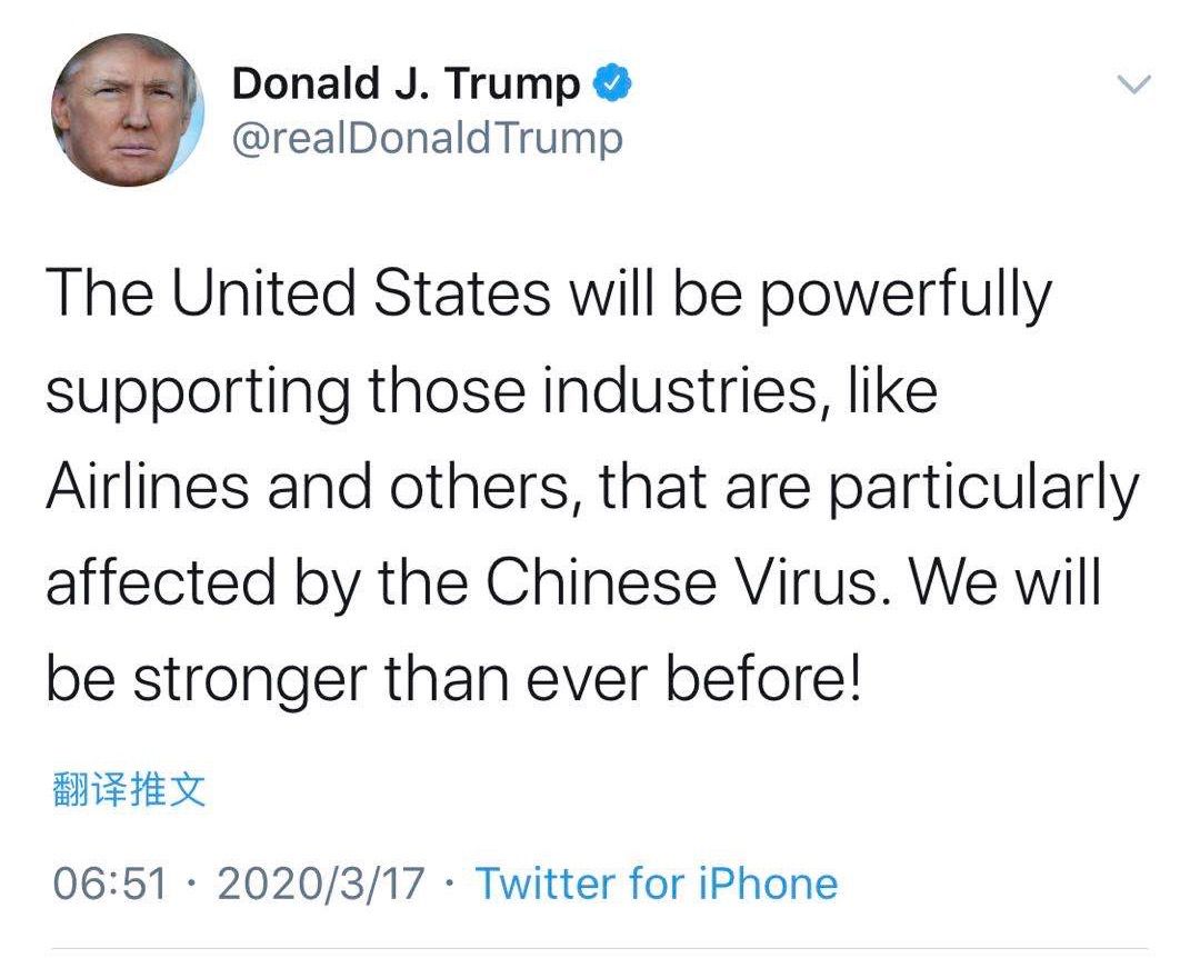 3月16日,美國三大股指收盤暴跌均超過11%,並觸發8天內的第3次熔斷。特朗普發推特稱:美國將對航空業等其他受“中國病毒(Chinese Virus)”影響的行業給予強有力的支持。我們將會變得更強大!