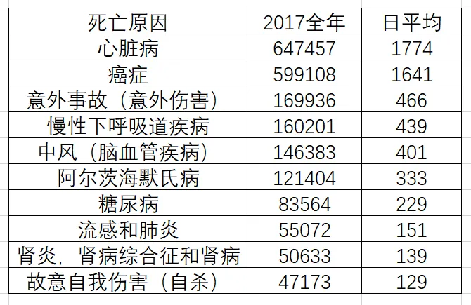 我們根據CDC的數據,算一下2017年美國人的主要死因:排名第一的心臟病,每天死亡1774人,第十位的自殺,則是平均每天129人。