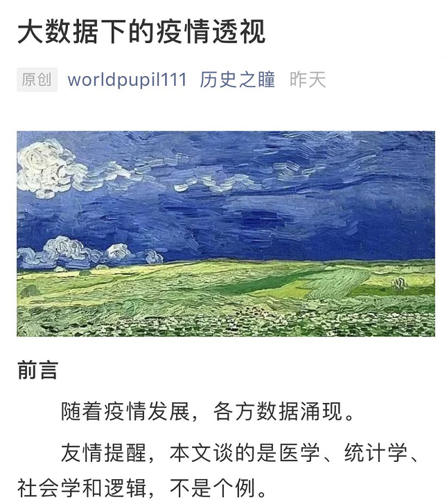 但沒想到,這兩天又看到一篇關於疫情的“分析”。不過感覺造謠技術現在也在不斷“升級”了,成為什麼“大數據透視”,說是用大數據分析了全球疫情,發現新冠不可怕,今年鬧疫情其實沒死多少人,政府的“封鎖策略需反思”。