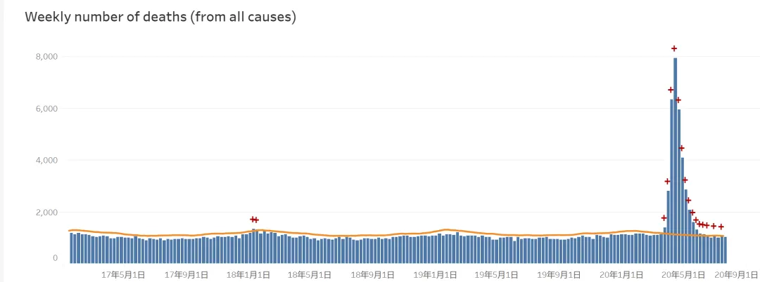 至於說美國說今年死亡人數反而比前幾年少?扯這種謊言之前,看看CDC給的這個曲線吧。新冠爆發時候那個尖銳的,每周多死幾千人的高峰,就是紐約慘重的代價。