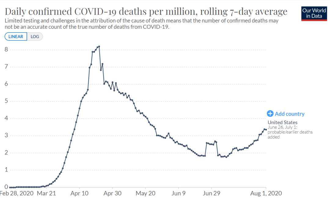 這個已經不是雞賊,而是公然作假了 —— 作者為了給讀者造成美國疫情已經接近尾聲的假象,拿一個多月前的曲線來騙人(尾部還不對)。實際上真實的美國死亡人數曲線,早在6月底就開始反彈了。