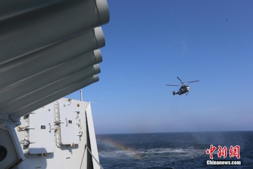 8/62   5月24日,中俄“海上聯合-2014”聯合軍事演習在東海海域繼續進行聯合反潛、聯合對海突擊、以及實際使用武器等戰術科目。圖為演習中的直升飛機。中新社發 張雷 攝