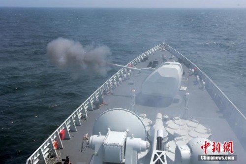6/62   5月24日,中俄“海上聯合—2014”軍事演習在東海海域進行“重頭戲”實彈射擊演練。據悉,實際使用武器演習將包括對海上目標實施主炮射擊,並由副炮攻擊空中目標。圖為進行實彈射擊的艦船。中新社發 張雷 攝