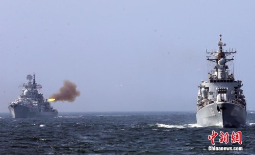 2/62   中俄“海上聯合——2014”軍事演習5月22日至24日在中國東海北部海空域舉行,雙方集中展開錨地防禦、聯合護航、聯合防空、聯合反潛、聯合搜救、聯合查證識別、聯合解救被動劫持船舶、聯合對海突擊、和實際使用武器等多科目演練。中新社發 宋吉河 攝