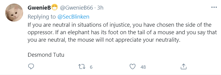 因此,一位網友則引用了諾貝爾和平獎戴斯蒙·圖圖的一句經典名言,指責布林肯的“偽中立”,也一針見血地點破了美國對他國內政干涉的本質:“當一頭大象踩着老鼠的尾巴,還說自己是‘中立’的,那老鼠可不會認同這種‘中立’。