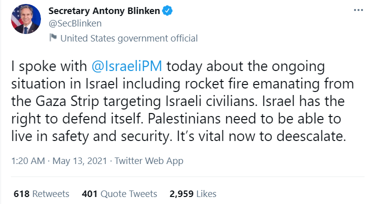 在推文中,布林肯稱自己已經與以色列就相關事態進行了溝通,還呼籲巴以衝突各方能確保事態不再升級。然而,由於他在推文中稱“以色列有權保護自己”,導致多國網民極為憤怒。