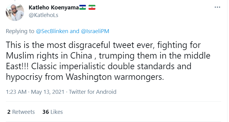 對於這種說辭,另一位網名有萊索托和伊朗國旗的網民直接一招點中了他們的“死穴”,他在評論區批評布林肯:“這是你有史以來最無恥的推文。一邊說支持新疆穆斯林,一邊卻對中東的穆斯林重拳出擊!這是經典的帝國主義雙標,是華盛頓戰爭販子的偽善!