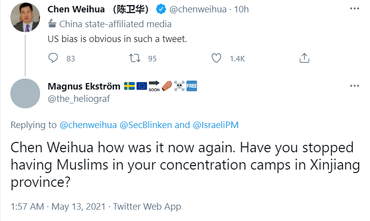 但就像中國媒體人和外交官每次發聲時那樣,總有幾個複讀機式的槓精繞過話題,千里突襲中國的新疆問題,比如下面這個瑞典網民一邊追問“你們中國關停了在新疆的‘集中營’嗎?”,一邊在評論區為自己“圍疆救美”感到沾沾自喜。