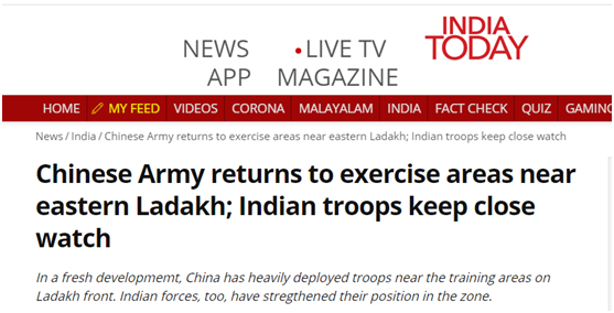 印度高层消息人士告诉《今日印度》,“中国军队回到他们的传统训练区域,在东拉达克附近进行演习。”“消息人士”称,大批中国军队在那里举行演习,他们位于纵深地区的不同地点,中国军队可以在几小时内从这些地点抵达印度前线。