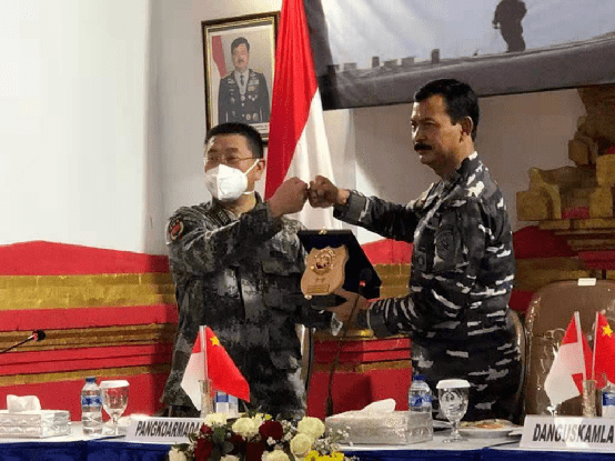 图片:印尼军方对中国的帮助表示感谢,击拳以示互相信任。