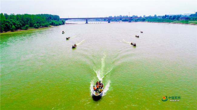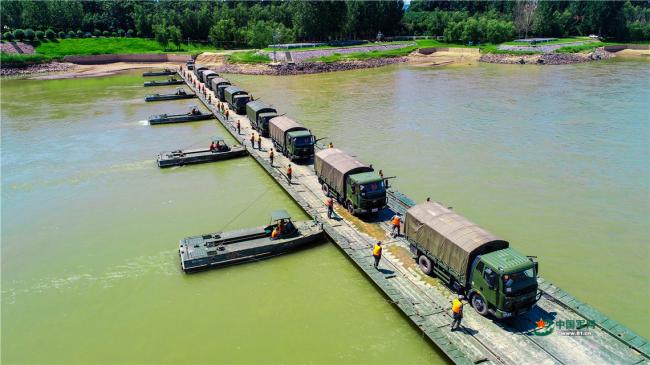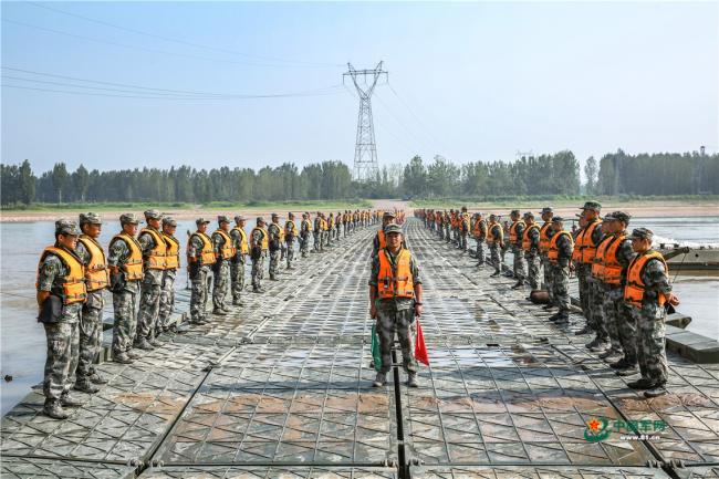 | 航拍工程兵搭建浮桥,场面壮观 |