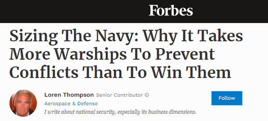 但这里有一个问题,美军仅持续出现在一个地方以阻止战争爆发是不够的。美军需要在几个地方,比如北大西洋、波斯湾和地中海保持军事力量,这样所有潜在的对手都会被吓退。而这就意味着,如果美国的目标是防止战争发生,那么海军将需要比在战斗中取得胜利更多的军舰。