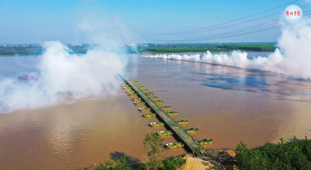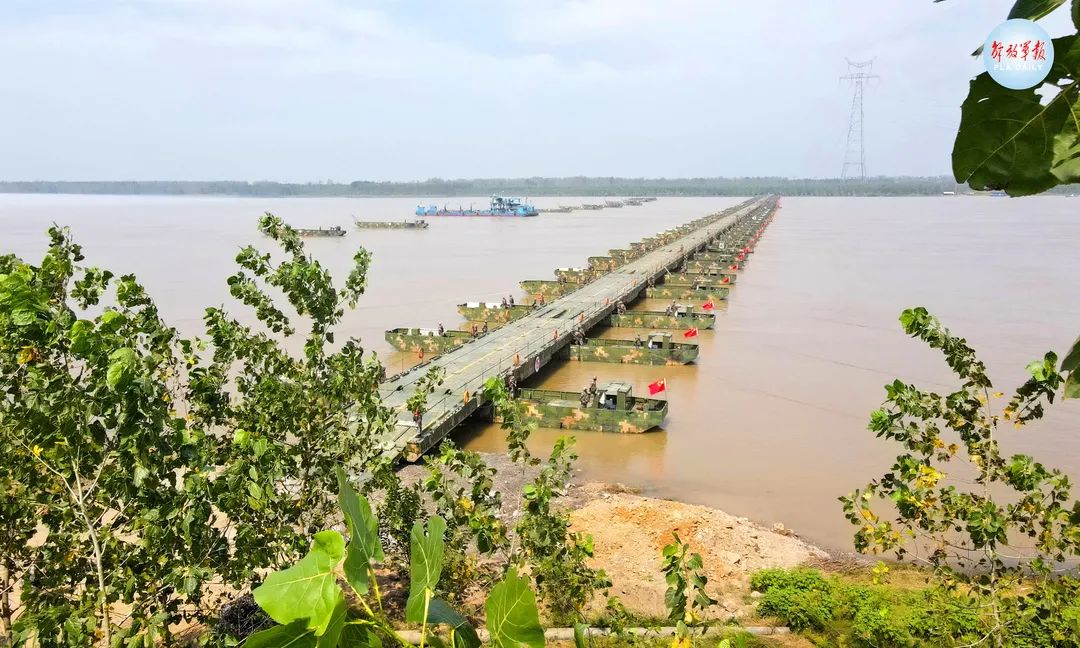 长江江岸,数百台重型装备疏散隐蔽在树丛里。“浮桥架设作业开始!”一声令下,一节节门桥从岸边隐蔽处快速驶出,直指预定渡场……上午9时55分,演习正式开始 。