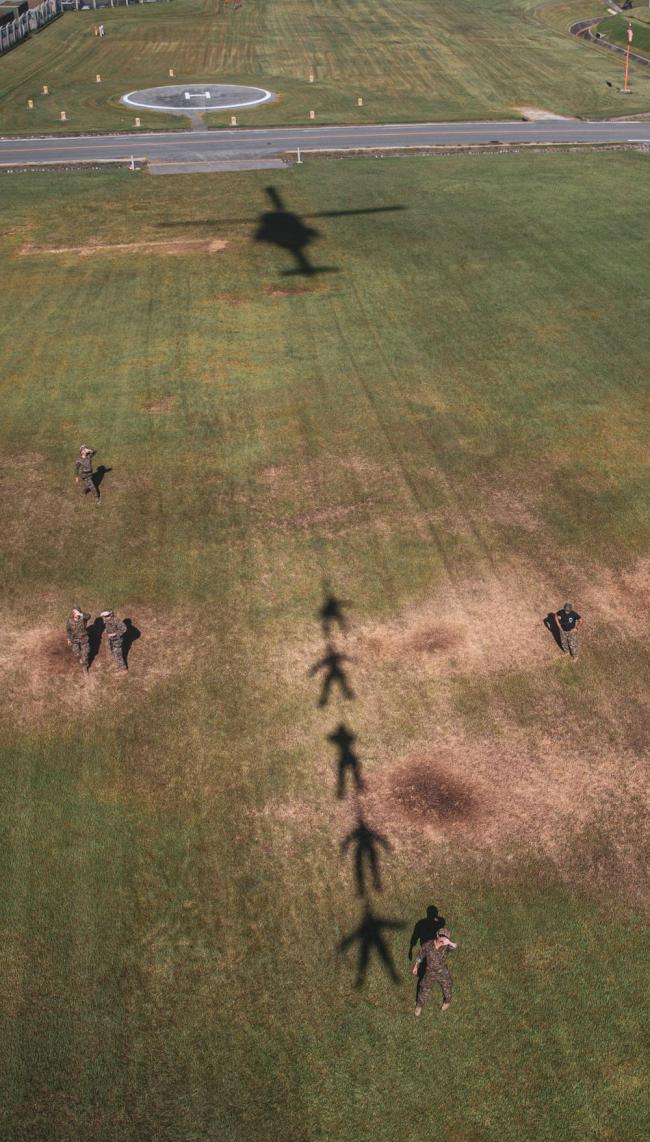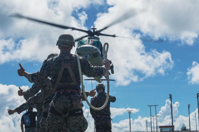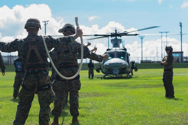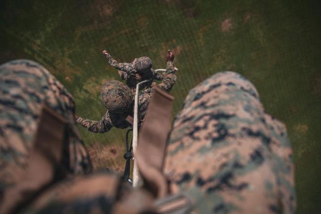 2021年9月9日,在日本沖繩漢森營地進行的特種巡邏插入和提取 (SPIE) 索具訓練演習中,美國海軍陸戰隊與海軍陸戰隊遠征軍 (MEF) 共同訓練。直升機運送依靠索具懸掛的士兵“人鏈”,相當驚險。