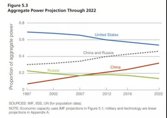 似乎是由于看到了图表曲线的走势,兰德公司才强调“中俄力量的总和”将在2022年“继续接近,而不是超越美国”,但显而易见的一点在于,在这个时间点上的中俄综合实力之和仍在增长,美国的实力则仍在持续下滑。由此,兰德公司只能将最后的时间点定在“美国较中俄仍然稍占优势”的2022年,但在这之后,双方的实力差距又是否会被扭转,兰德公司报告的作者并不愿意直接明说——不过即便如此,其制作的趋势图似乎已经就这一问题给出了答案。