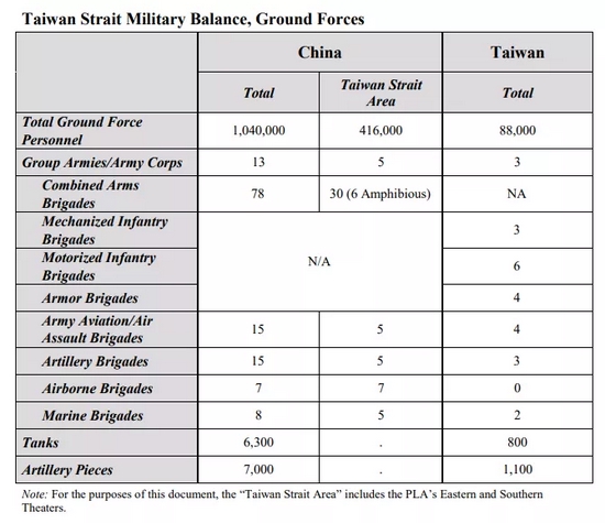 五角大樓這些數據的準確性向來不靠譜,但至少可以從中看出美國眼中的兩岸戰力到底差多大。例如該報告顯示,解放軍在台海方向的東部戰區和南部戰區擁有41.6萬地面部隊,台軍總共只有8.8萬;解放軍兩大戰區擁有30個具備聯合作戰能力的合成旅(包括6個兩棲合成旅),而台灣陸軍的編制還停留在老式的摩托化步兵旅(6個)、機械化步兵旅(3個)和裝甲旅(4個)。在空軍方面,解放軍在台海方向擁有700架戰鬥機、250架轟炸機或攻擊機、20架運輸機和100架特種任務飛機,而台灣空軍僅有400架戰鬥機、30架運輸機和30架特種任務飛機。差距最大的則在海軍方面,解放軍在台海方向擁有1艘航母、21艘驅逐艦、41艘護衛艦、49艘登陸艦、33艘常規潛艇、2艘攻擊核潛艇、4艘戰略核潛艇與68艘導彈快艇,而台灣僅有4艘驅逐艦、22艘護衛艦、14艘登陸艦、2艘常規潛艇(顯然台灣那兩艘二戰時期的古董潛艇被五角大樓無視了)和44艘導彈快艇。報道還提到,如果有必要,解放軍其他戰區的力量也能快速向台海方向增援。