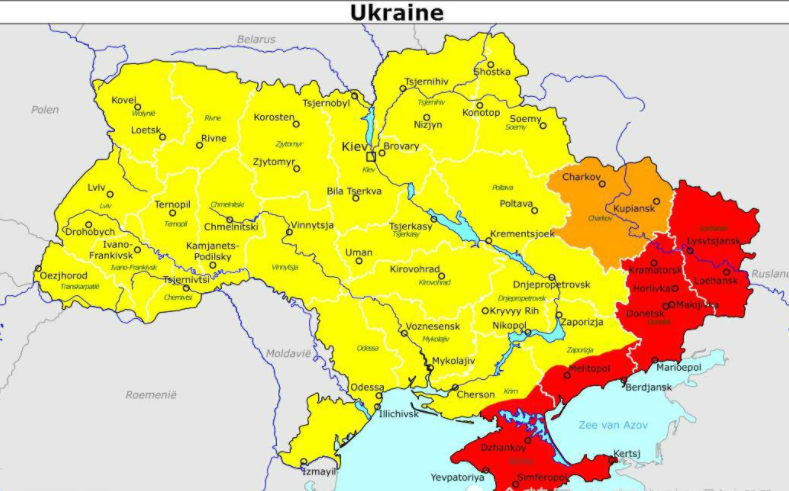 (乌克兰内战:黄色为乌克兰政府控制区,红色为所谓的“东乌民兵”控制区,橙色为双方争夺区域)