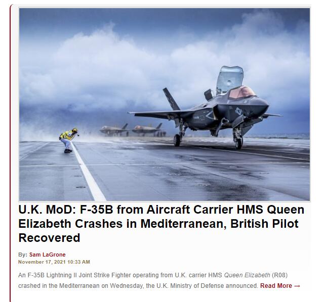 英國國防部11月17日發布聲明證實,一架英國皇家海軍“伊麗莎白女王”號航母(R08)搭載的F-35B隱身艦載戰機17日在地中海墜毀,飛行員獲救。這架F-35戰機隸屬於英國皇家空軍,這是英國F-35機隊首次出現事故。