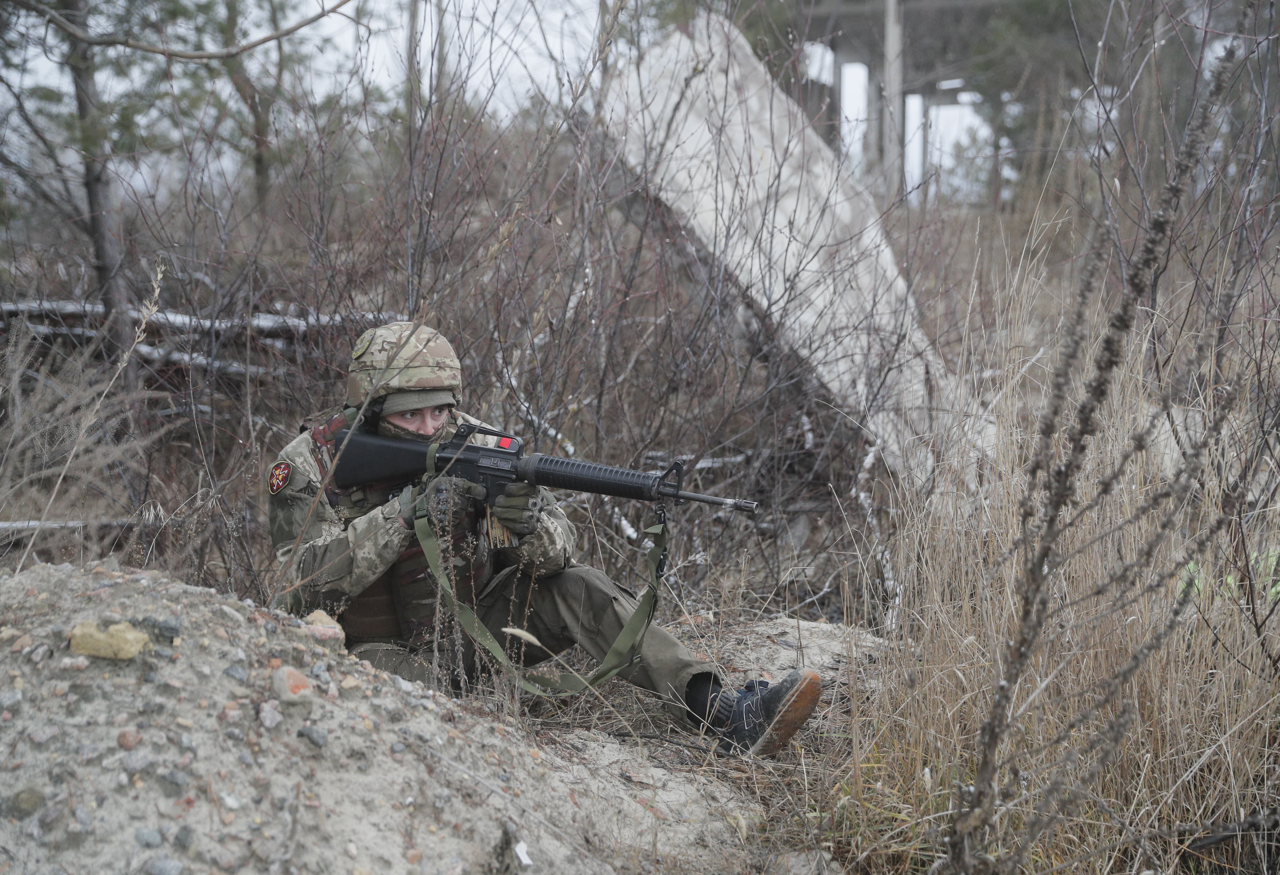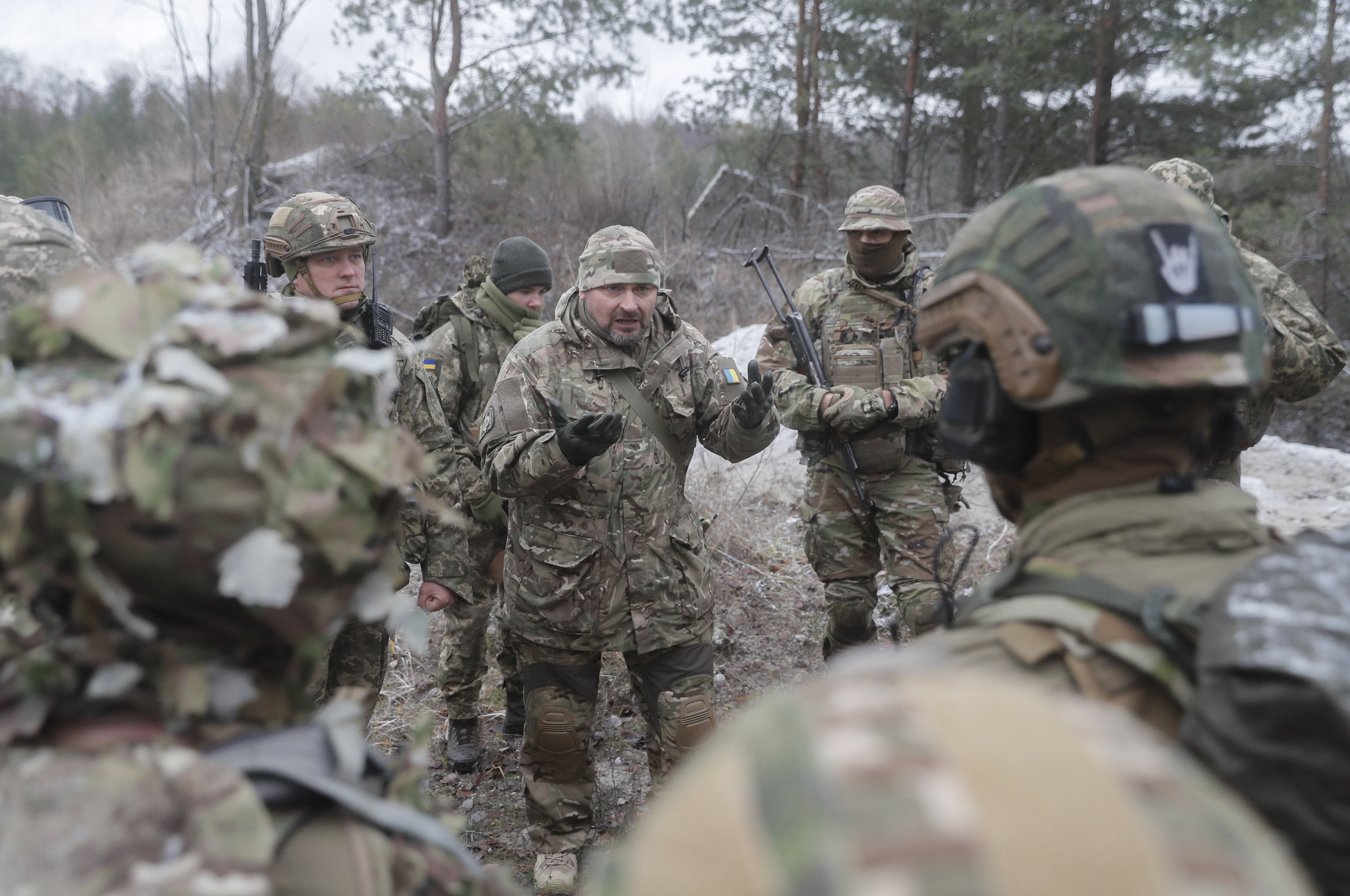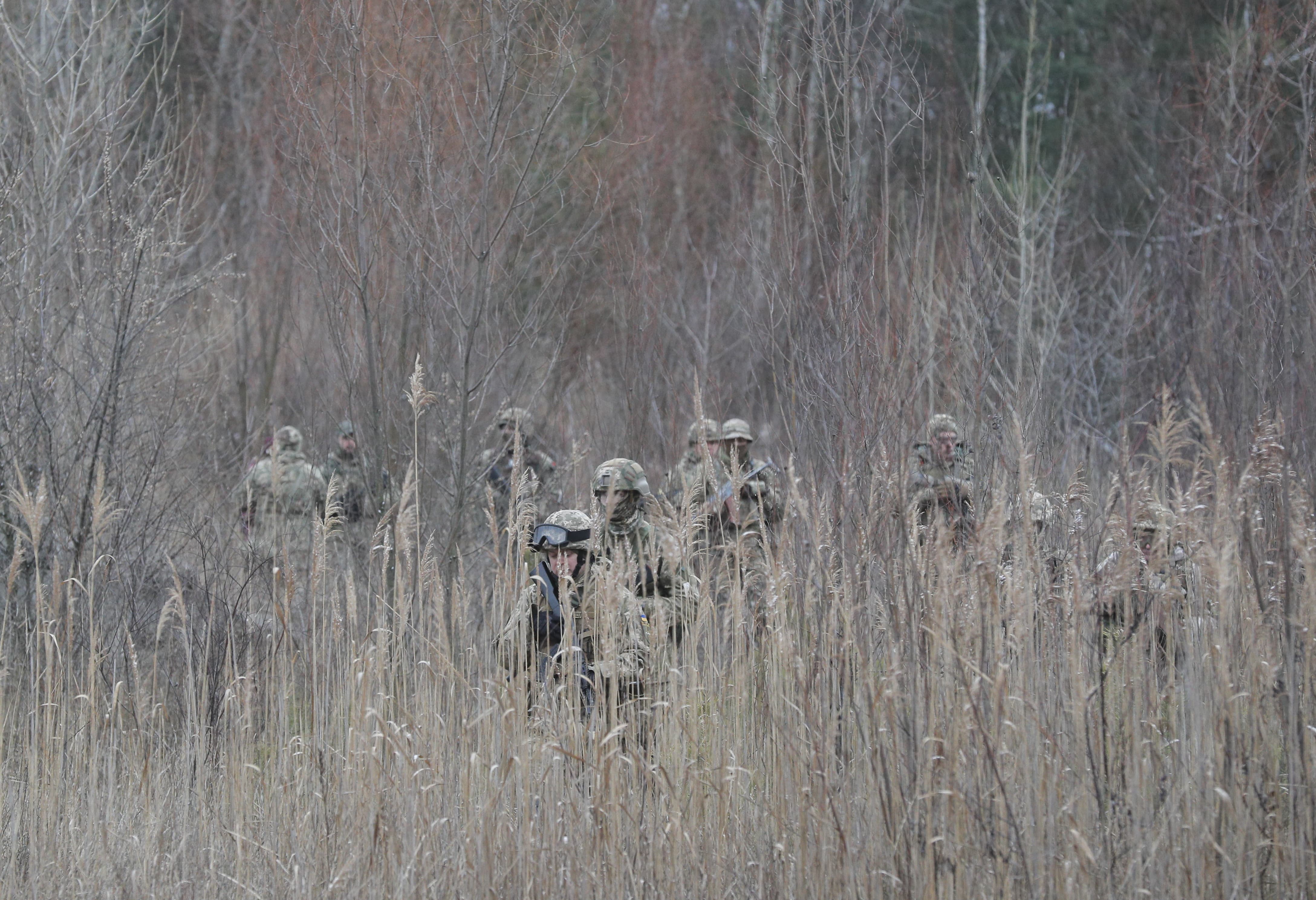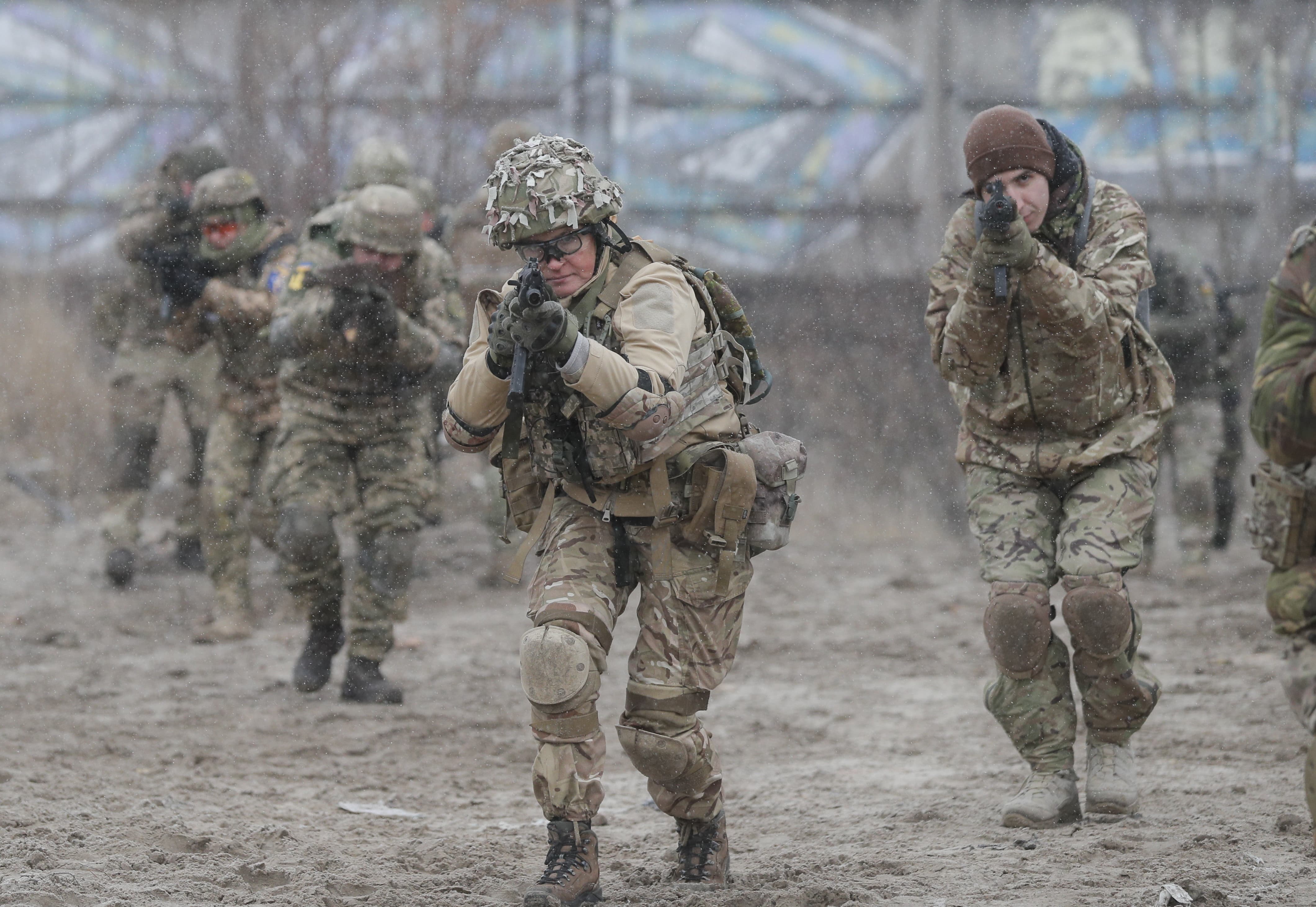 當地時間2021年12月18日,烏克蘭基輔附近一訓練場,烏克蘭預備役人員參加軍事演習。