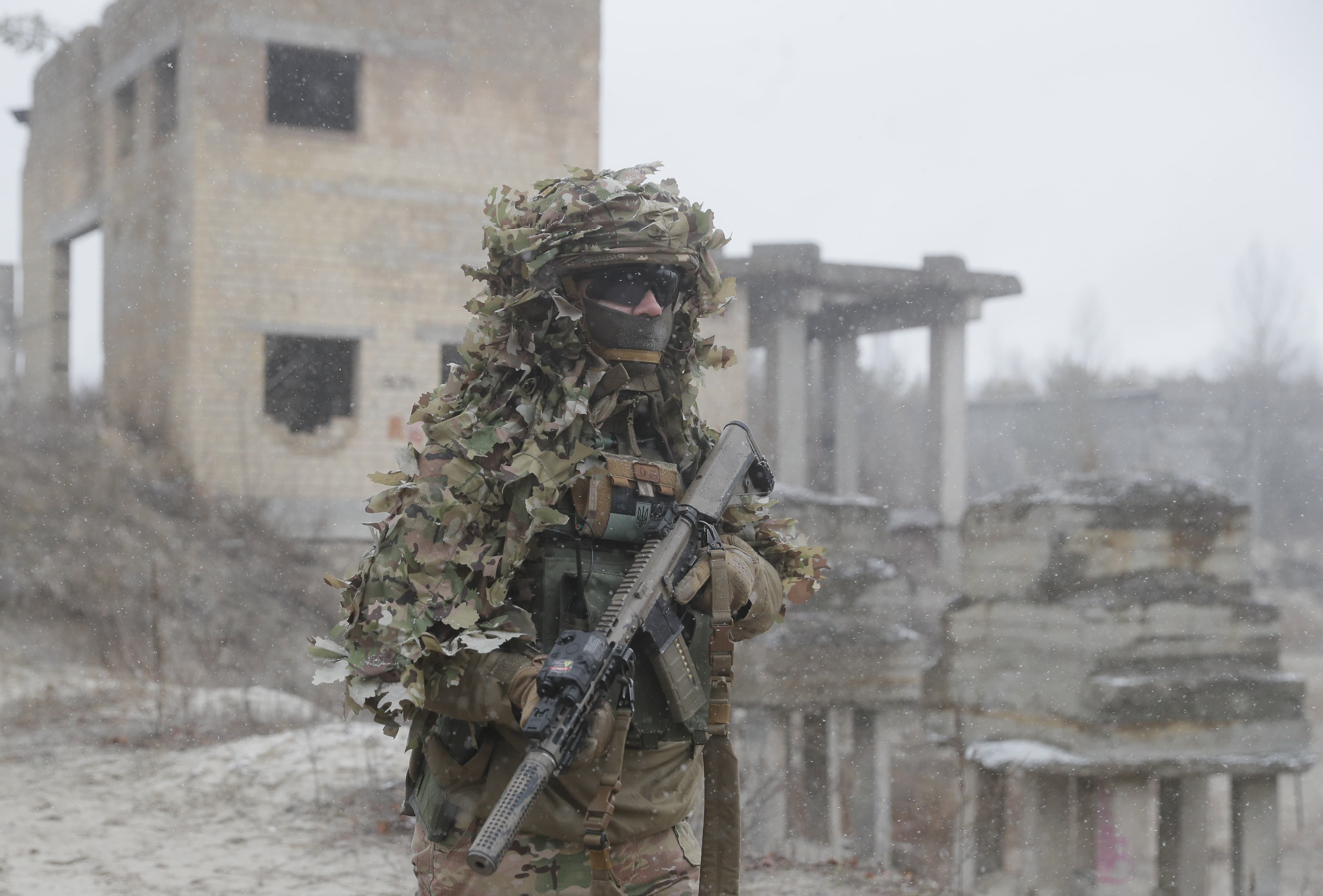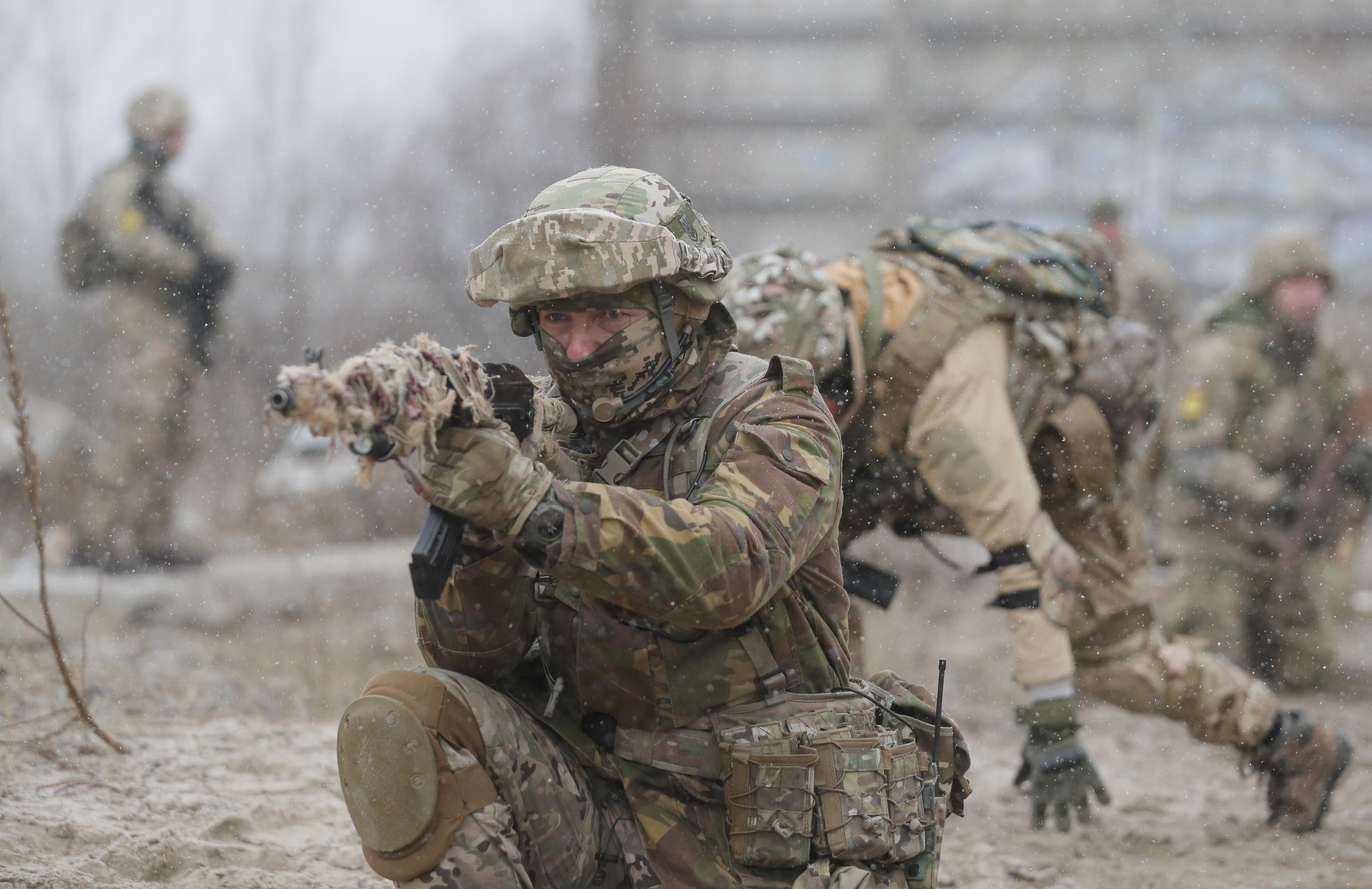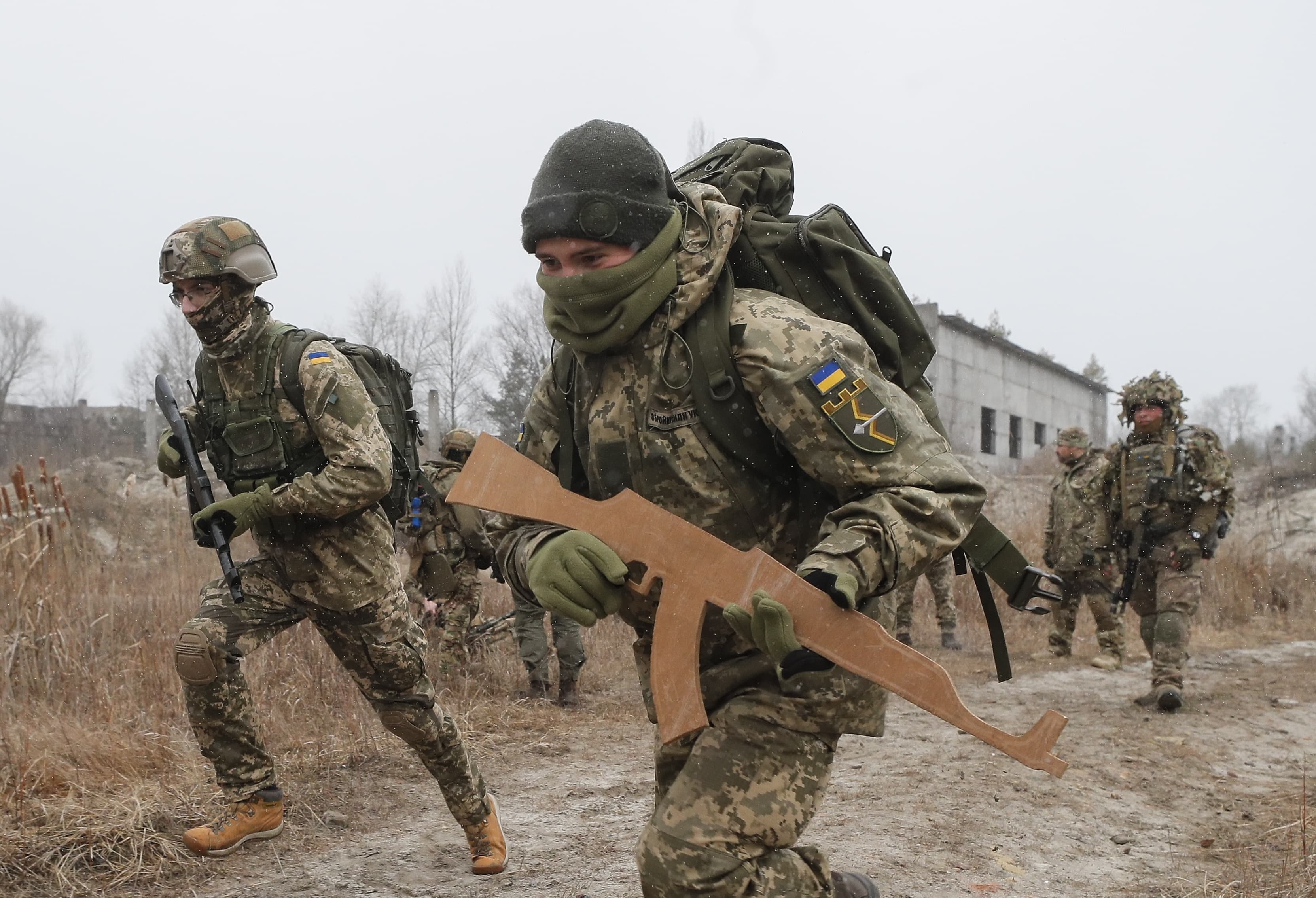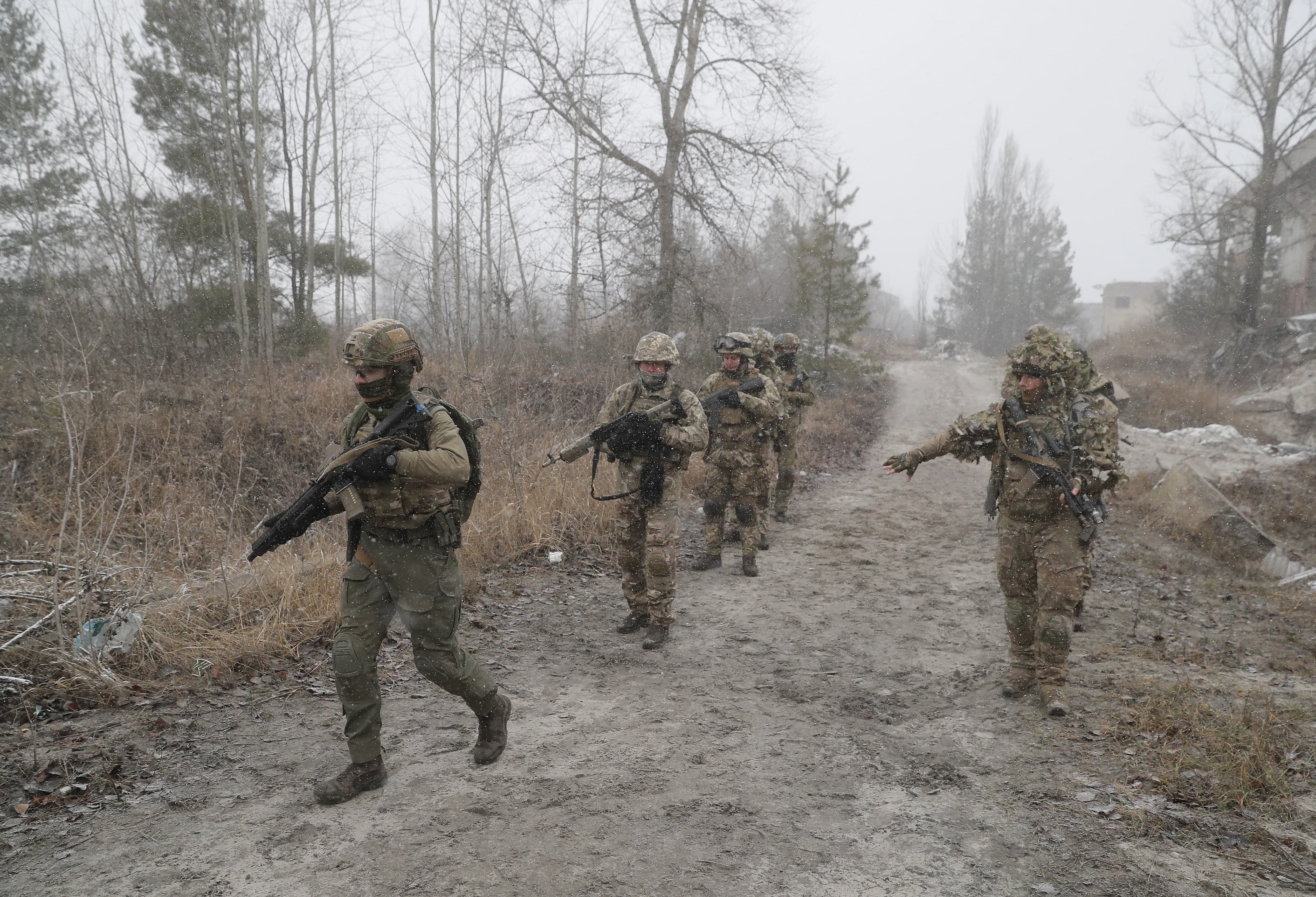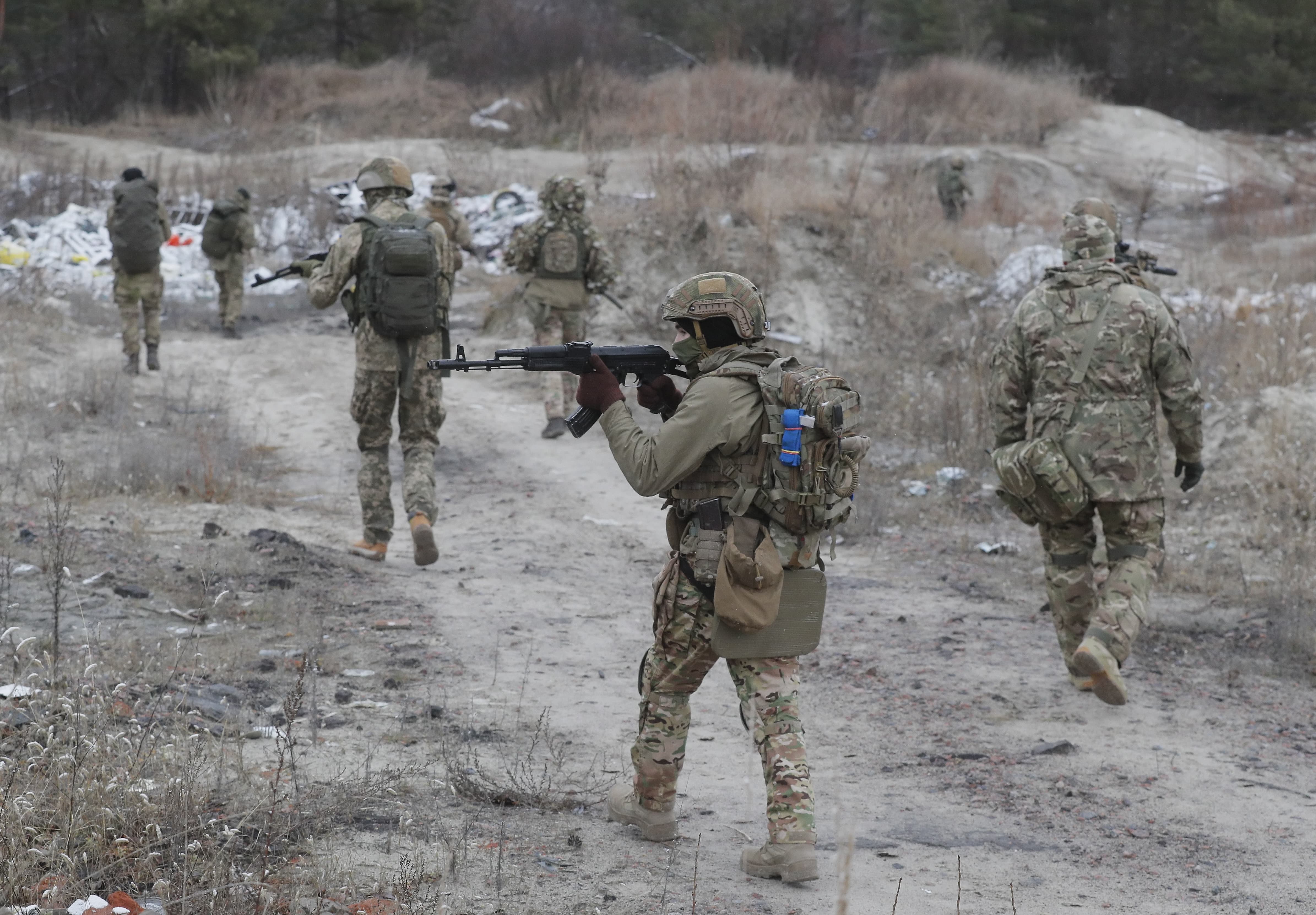 當地時間2021年12月18日,烏克蘭基輔附近一訓練場,烏克蘭預備役人員參加軍事演習。