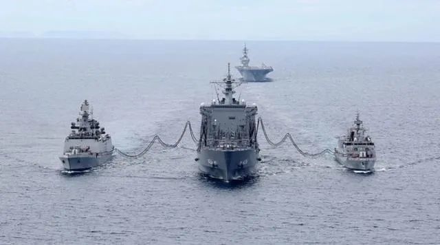 早前“马拉巴尔”演习中的日本“准航母”和印度军舰等舰艇(新华网)
