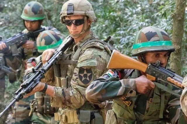 美军士兵与印军士兵参加演习画面(新华网)