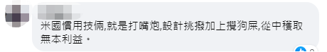 还有人说,“要认清美国的嘴脸。”“美国人眼里只有利益。”“米国(美国)惯用技俩,就是打嘴炮,设计挑拨加上搅狗屎,从中获取无本利益。”