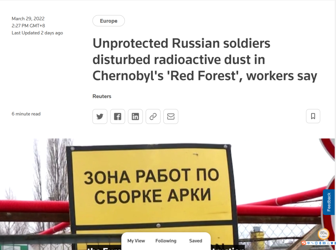 不過老劉查閱了俄羅斯主流媒體並沒有看到有關俄軍從切爾諾貝利撤軍的說法。 老劉認為,目前最值得關注的,未必是俄軍方是否真的已經開始撤離駐守切爾諾貝利核設施的俄軍部隊,而是俄軍如果計劃要撤離相關部隊,是否會與烏克蘭政府軍進行一些交接。俄軍在對烏特別行動開始之初,就派出空降兵部隊占領切爾諾貝利核設施,就是擔心該設施中的核廢料會被一些極端武裝分子利用。 如果俄軍方突然撤離駐守相關設施的俄軍部隊,看似對烏克蘭局勢是一個好事,但一旦出現這種“核設施防護真空”,其實無論對俄、對烏都不是好事。老劉認為,在“大幅減少”俄軍在烏克蘭首都基輔周邊軍事行動的背景下,不排除俄軍會陸續撤出切爾諾貝利等地區的可能性,畢竟俄軍也沒有必要一直占領着那麼一片廢棄之地。但這個過程應該會有意無意給烏克蘭相關部隊留出一定的交接時間。 除了“戰區”等媒體的報道,路透社近日還有一篇有關切爾諾貝利的文章引發高度關注。這篇文章稱,切爾諾貝利核設施的工人稱,占領切爾諾貝利核設施的俄羅斯士兵在沒有防護的情況下駕駛他們的裝甲車通過一個名為“紅森林”的輻射強度很高的區域,並聲稱揚起了放射性塵埃。 兩個工作人員都表示,他們目睹了俄羅斯坦克和其他裝甲車輛穿過“紅森林”,這是切爾諾貝利周圍地區放射性污染最嚴重的地區,連工作人員都不會進入。 據路透社報道,其中一名工作人員說,他在與普通俄軍士兵交談時發現他們沒有聽說過切爾諾貝利核事故。