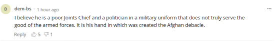 “我认为他是一个可怜的参谋长,一个穿着军装的政客,他并不能真正为军队服务。正是他一手造成了阿富汗的溃败。”