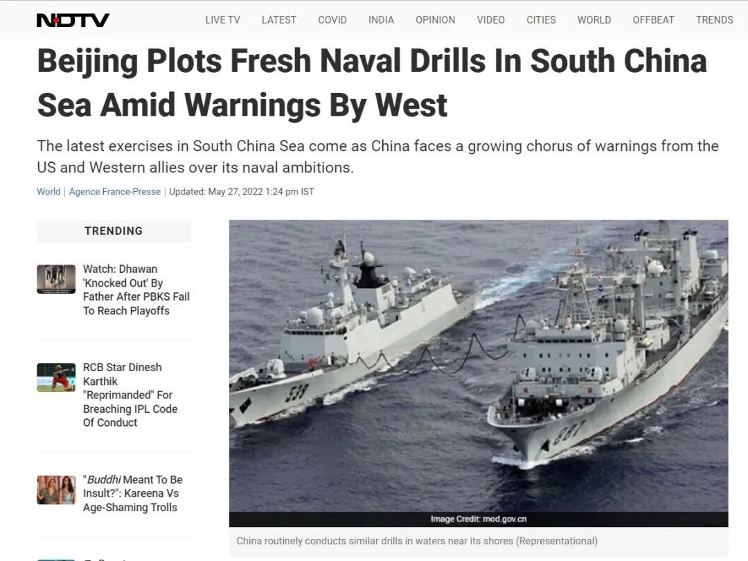 印度新德里電視台網站文章的標題為“在西方的警告下,北京計劃在南海進行新的海軍演習”。報道稱,這些演習計劃在中國海南省海岸附近不到25公里(15.5英里)處的海域舉行,正值美國對中國在從南海到太平洋島嶼地區日益增長的軍事和經濟存在發出警告之際。中國海事部門周四在一份聲明中表示,航行警告涉及大約100平方公里的區域,將禁止海上交通5個小時。