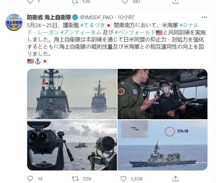 日本海上自衛隊推特賬號當天也發布了與美國海軍進行演練的消息。但無論是日本共同社報道中的配圖還是海自推特賬號上發布的演練畫面,都沒有出現美國航母的身影,只有一張軍艦的畫面中,標註出了遠處的F/A-18戰機。