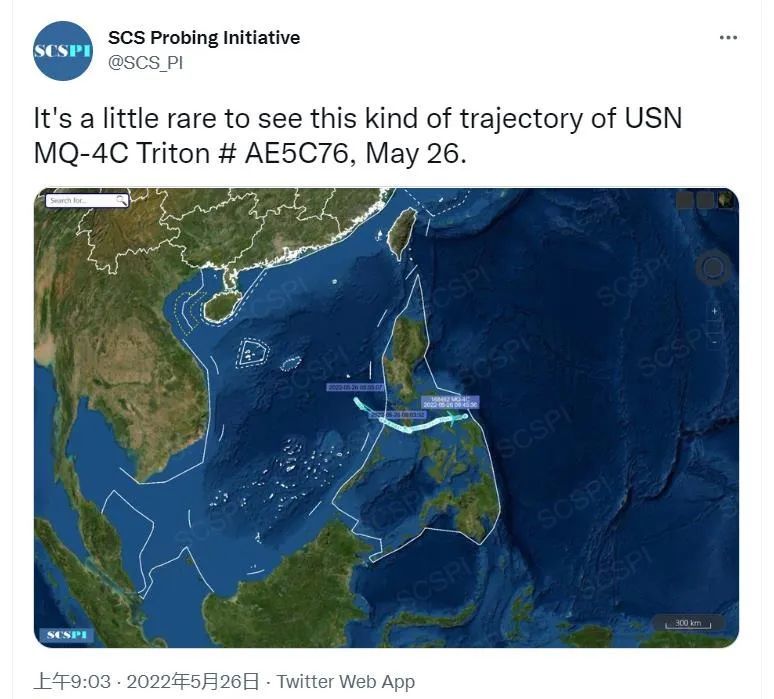 南海戰略態勢感知平台推特賬號26日發布消息稱,美國海軍“人魚海神”無人機26日飛了一條非常罕見的路線。從南海戰略態勢感知發布的飛行路線圖來看,似乎美無人機是飛越了菲律賓的領空。