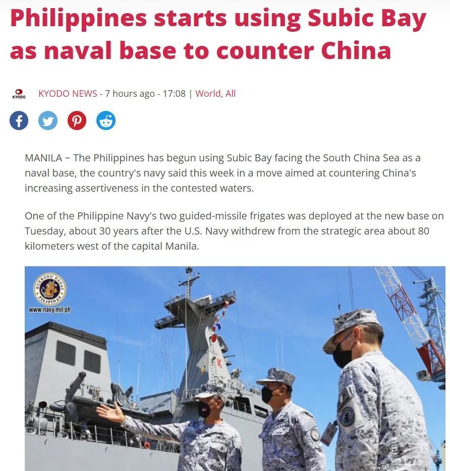 還有一個動向值得關注。日本共同社27日一篇英文的文章稱,菲律賓開始使用蘇比克灣海軍基地以對抗中國。菲律賓海軍本周表示,菲律賓已開始使用面向南海的蘇比克灣作為海軍基地。菲律賓海軍的兩艘導彈護衛艦之一於周二部署在新基地。同時,菲律賓空軍計劃在蘇比克灣國際機場部署飛機,以監測和應對海上爭端。