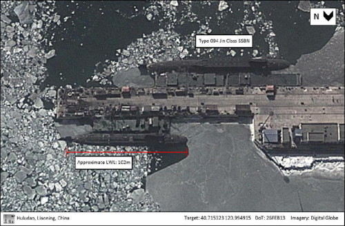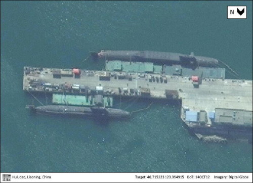 1/13   近日有外媒刊文称为谷歌地图提供卫星照片的卫星拍到中国葫芦岛的核潜艇建造厂内出现了疑似第五艘094型核潜艇。其依据是这张照片摄于2013年10月10日,显示一艘094型在干船坞内进行作业,而2013年2月的照片显示一艘094潜艇在码头停靠;