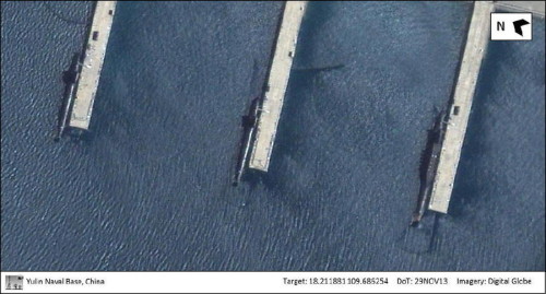 2/13   同时近期的卫星图显示,中国海军在南海舰队榆林基地部署了3艘094型。作者据此得出2013年10月出现在干船坞的094可能是第5艘的结论。实际上,潜艇每隔一段时间需要返厂大修,所以同一艘出现在不同位置的可能性很高;