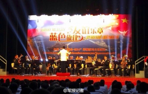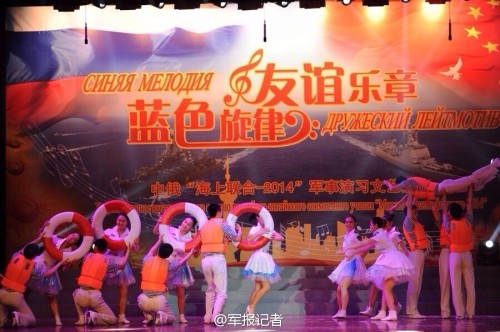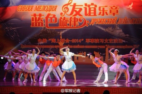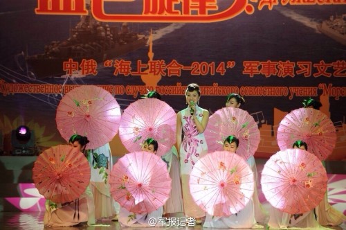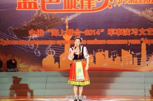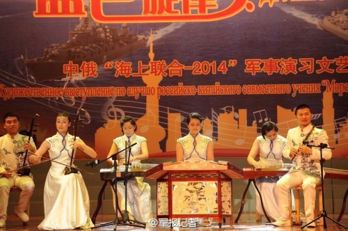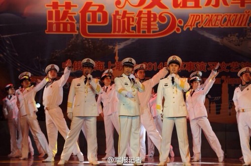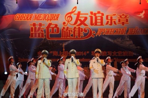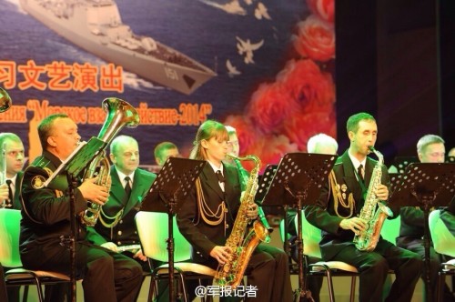 | 1/9 | | | | 25日晚,中俄两国水兵《蓝色旋律 友谊乐章》联欢活动在驻沪某基地举行。东海舰队水兵演出队和俄太平洋舰队司令部军乐团为双方参演官兵表演了《喀秋莎》《浪花之舞》《莫斯科郊外的晩上》等经典曲目。中俄官兵边观看边交流共话友谊。(来源:军报官方微博 秦超、李高健) |