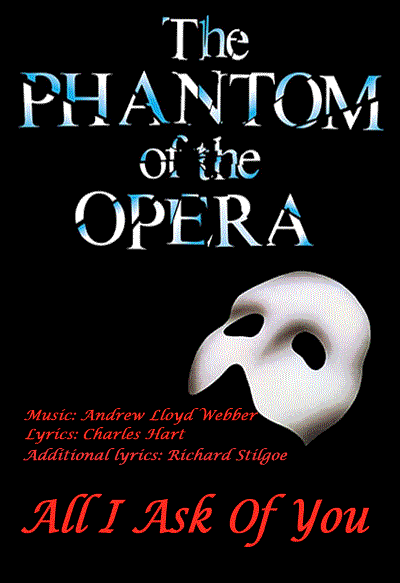 ![]() 歌曲下载 Raoul: No more talk of darkness, forget these wide-eyed fears; I'm here, nothing can harm you, my words will warm and calm you. Let me be your freedom, let daylight dry your tears; I'm here, with you, beside you, to guard you and to guide you. Christine: Say you'll love me ev'ry waking moment; turn my head with talk of summertime. Say you need me with you now and always; promise me that all you say is true, that's all I ask of you. Raoul: Let me be your shelter, let me be your light; you're safe, no one will find you, your fears are far behind you. Christine: All I want is freedom, a world with no more night; and you, always beside me, to hold me and to hide me. Raoul: Then say you'll share with me one love, one lifetime; let me lead you from your solitude. Say you need me with you, here beside you, anywhere you go, let me go too, Christine, that's all I ask of you. Christine: Say you'll share with me one love, one lifetime. Say the word and I will follow you. Together: Share each day with me, each night, each morning. Christine: Say you love me... Raoul: You know I do. Together: Love me, that's all I ask of you. Anywhere you go let me go too Love me... that's all I ask of you. |