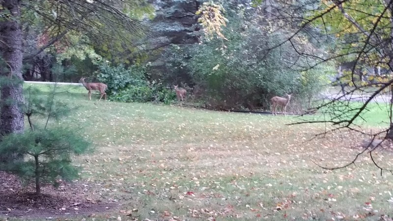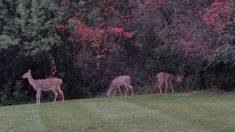 昨天下班回家,進入住宅區又路遇鹿們。用手機給鹿們留了個影,便趕緊進家門。今早離開家時,又見鹿們在自家的車道旁,於是又用手機給鹿們留影后奔公司而去。去公司的路上在想,昨晚與今早的鹿們是同一家嗎?剛剛回家後細看手機照片,卻見鹿們背後的樹葉已成秋色,層林盡染。 昨傍晚的鹿們: